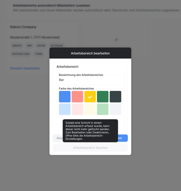 Löschen: Der Arbeitsbereich wird dauerhaft entfernt – aber nur, wenn noch keine Schichten darin erfasst wurden. Sobald Schichten existieren, kann der Arbeitsbereich nicht mehr gelöscht, sondern nur noch deaktiviert werden.